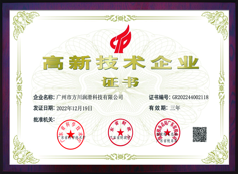 公司成立于2005年,作為國家高新技術企業,是廣東省潤滑油行業協會金屬加工液分會會長單位、中國表面工程協會常務理事單位,廣州市新材料產業發展促進會會員單位,也是美國磨潤協會(STLE)會員。公司被評為廣東省守合同重信用企業、黃埔區瞪羚企業、廣州市 “專精特新”企業,堅持質量求生存,以誠信求發展,做中國人自己的產品,堅持在細分領域將產品做到極致。